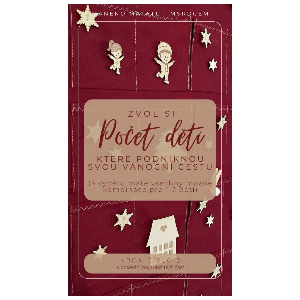 Balení obsahuje: látkový kalendář, dřevěnou tyč, šňůru na zavěšení, dřevěné vločky s číslem dne (24 ks), dřevěné ozdoby s mini úkoly (23 ks), figurku dítěte (1-2 podle zvolené varianty), 23 ks dřevěných vloček (sourozenecká varianta), 5 kolíčků s bílou bambulkou, e-book v pdf (zasíláme e-mailem)