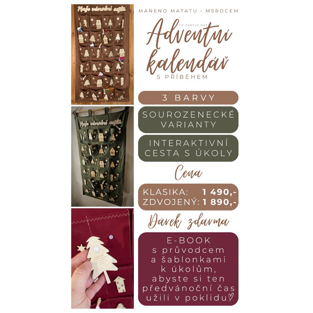 Kalendář obsahuje sadu dřevěných ozdob, které na své zadní straně ukrývají zábavný mini úkol, kterým si (nejen) maminky s dětmi mohou zpříjemnit čekání na Ježíška.